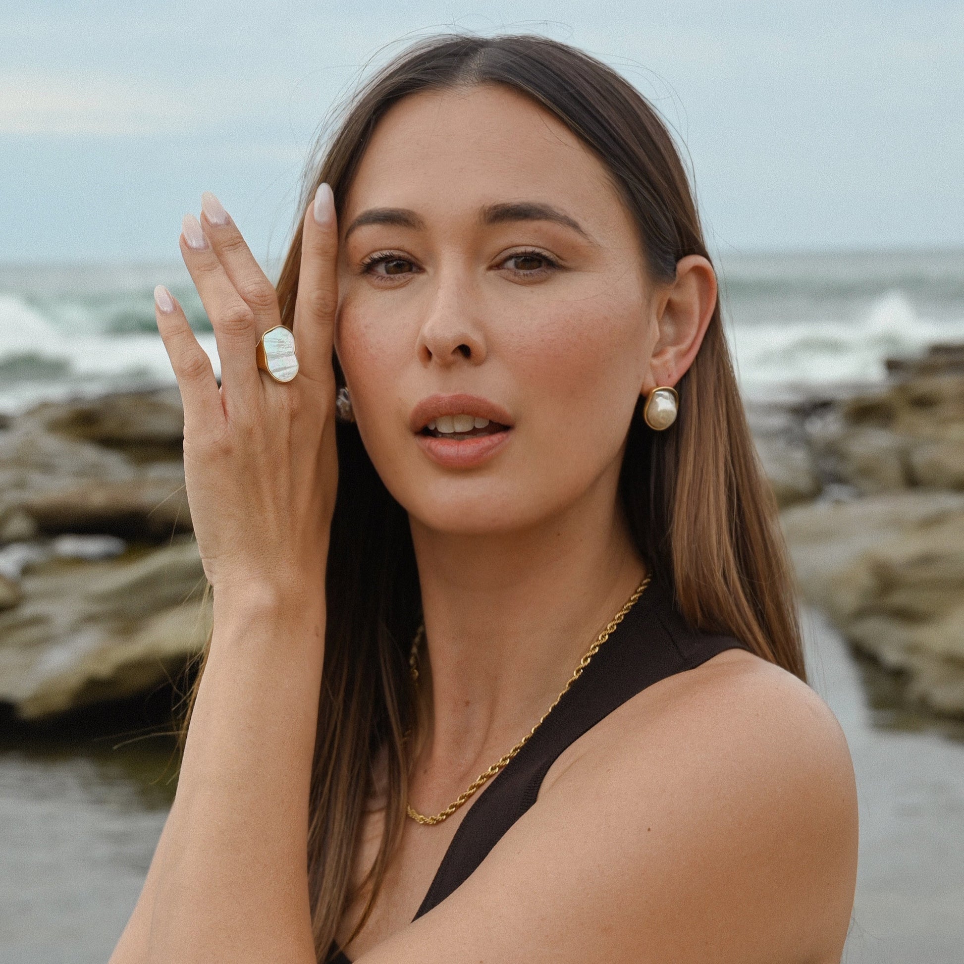 Radiating quiet luxury, the Blanc Éclat Ring features a luminous, cloud-shaped mother-of-pearl inlay set in a polished gold band. Its organic silhouette and soft iridescence capture light with every movement—an effortless statement of refined simplicity.