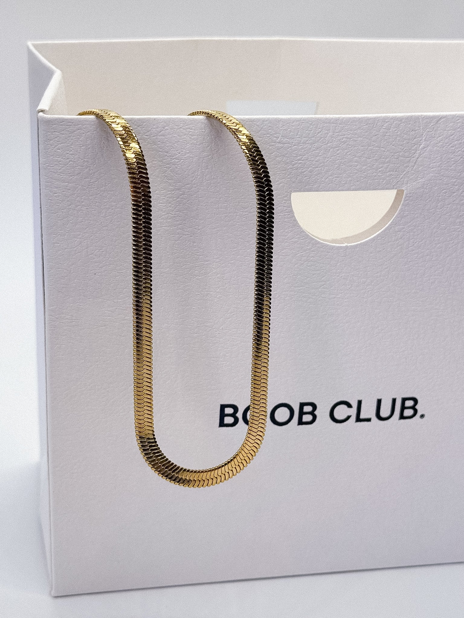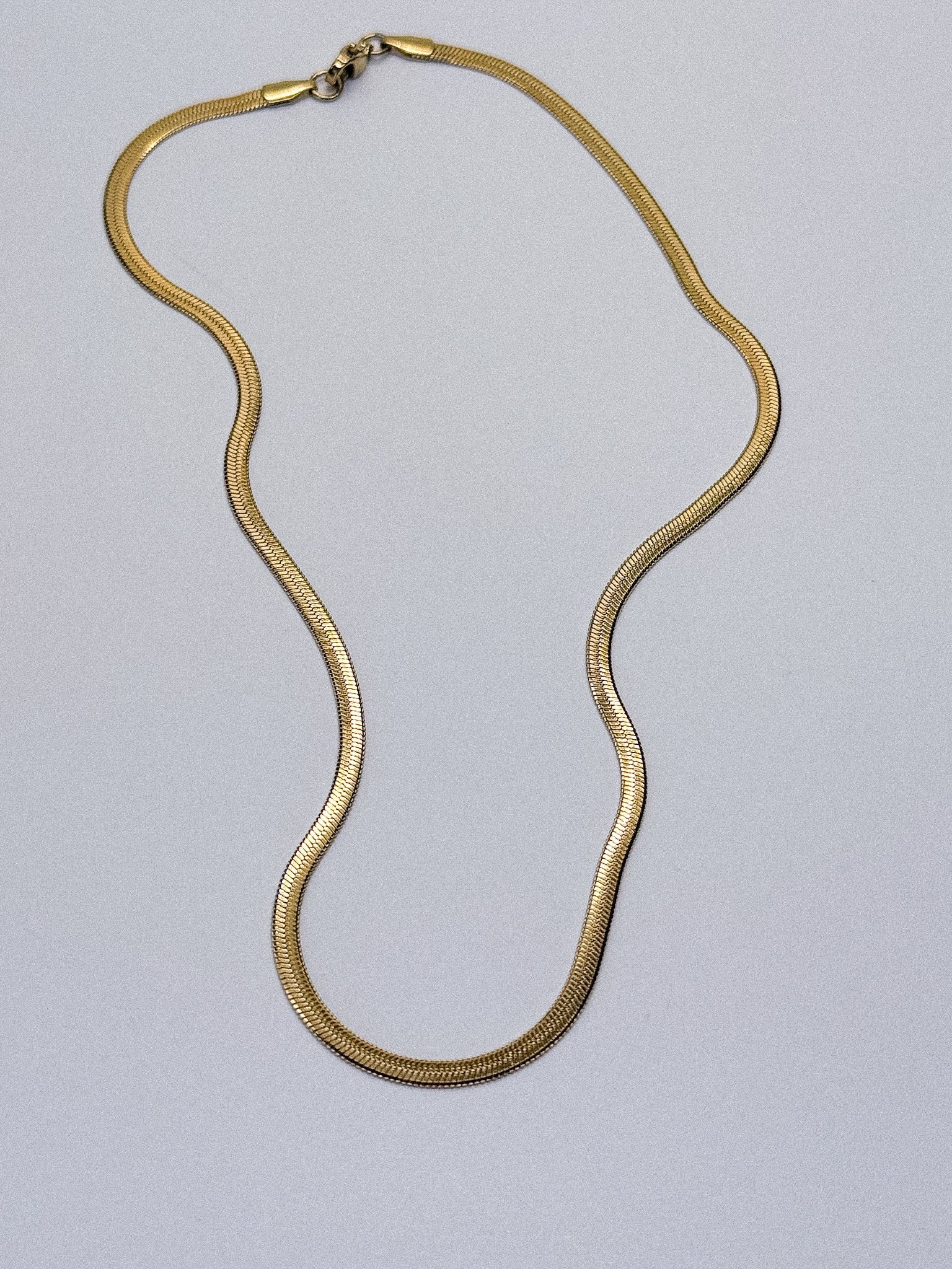 Introducing our sleek Snake Chain, crafted from premium 18k gold plated stainless steel. This stunning piece measures 18 inches long and features a thick, flat design that adds a touch of elegance to any outfit. Its waterproof construction ensures durability and resilience, making it a classic staple for everyday wear.