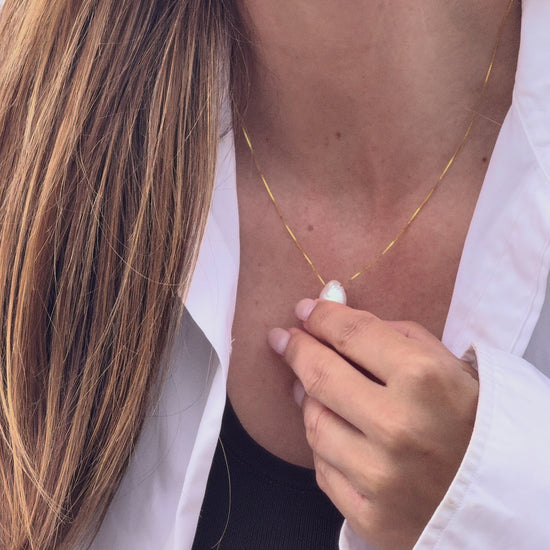 The Pearl Drop Necklace combines elegance and simplicity, featuring a lustrous natural pearl gracefully suspended from a delicate gold chain. Perfect for both everyday wear and special occasions, this timeless piece adds a touch of sophistication and charm to any outfit.